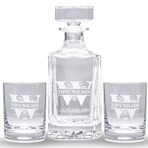 Gifts Inscribed Personalized Whiskey Decanter Set – Engraved Whiskey Decanter Bottle & Set of 2 Custom Drinking Glasses Laser Etched – Customized Whisky Gift for Wedding, Birthday, Fathers Day