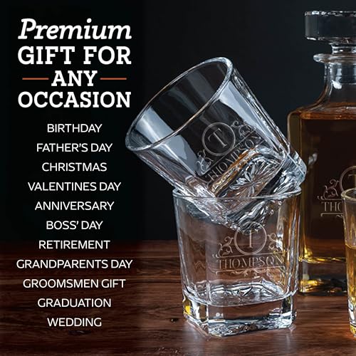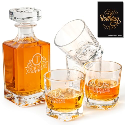 PERSONALIZED DECANTER SET WITH GLASSES FOR MEN & WOMEN – Express your sincere appreciation with this extraordinary personalized whiskey set, perfect as birthday gifts for men. The set houses a custom decanter with stopper, 4 personalized whiskey glasses, a heartfelt “Happy Birthday” card, and arrives in a splendidly giftable storage box