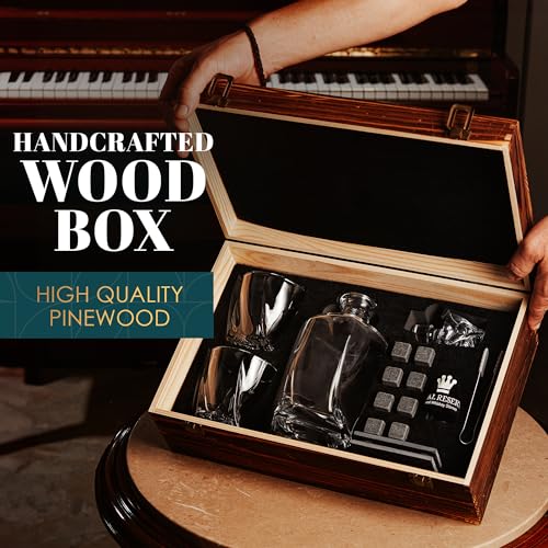 Exquisite Gift Set: This bourbon decanter set includes whiskey glasses, stones, coasters, and tongs, all beautifully packaged in a handcrafted wooden box. Perfect for gifting on Christmas, birthdays, weddings, or any special occasion.