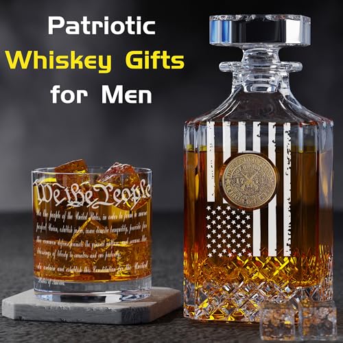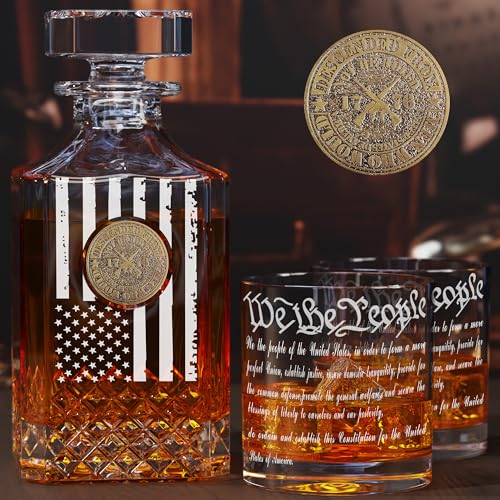 Whiskey Decanter Sets for Men, Inlaid 1776 Vintage Crest Whiskey Decanter Set for Bourbon, Etched We The People American Flag Decanter Set with Glasses, Unique Christmas Birthday Gifts for Men Dad