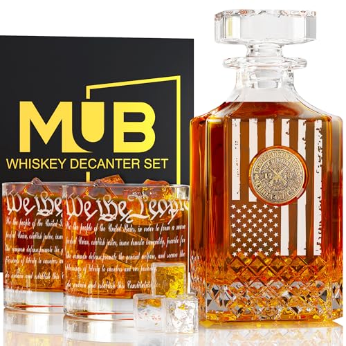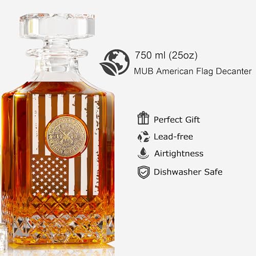 TAILORED FOR MEN – Crafted for the discerning man, our whiskey decanter set blends masculinity with sophistication and is an ideal addition to any gentleman’s collection. Tailored for whiskey lovers, express your personality and show your love for fine spirits and exceptional design as well as your patriotism with the MUB Whiskey Decanter Set for men. The American Flag Decanter takes center stage, adding a patriotic touch to any setting.