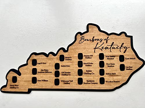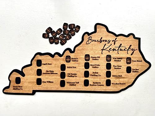 Bourbons of Kentucky trail map is lasercut and made of white oak. It measures 9 1/4″ x 19″. It features all distilleries that are on the Bourbon Trail. 18 barrels are included to complete your journey. Simply add a drop og glue to barrel and drop in slot to complete.