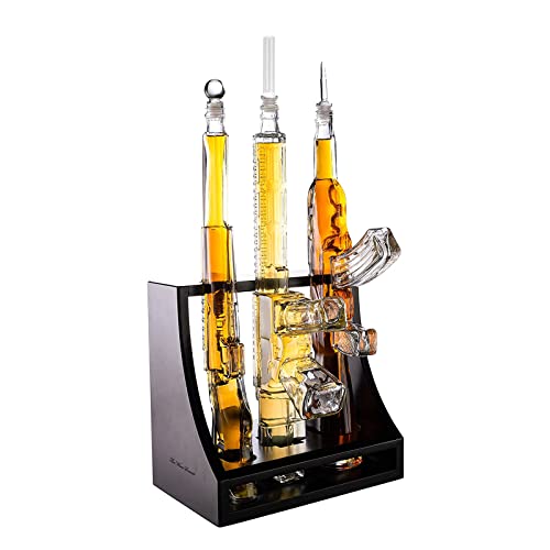 3 GUN WHISKEY DECANTER – Display your fine spirits in the striking shape and authentic outline of three real-life firearms: the AR-15, the AK-47, and the long rifle. This spectacular whiskey decanter set is sure to turn the heads of guests and spark lively conversation.