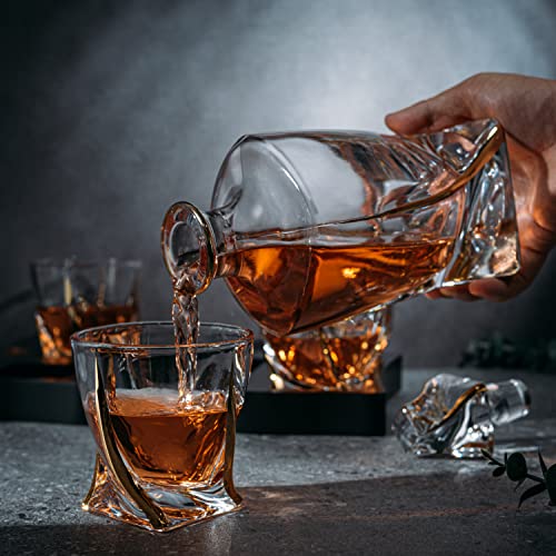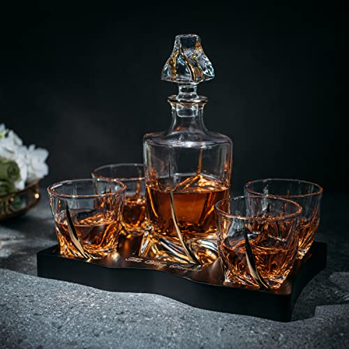 European Style Gold Wine & Whiskey Gold Twist Spiral Decanter 855ml with 4 Glasses & Wood Tray Set by The Wine Savant – For Home Bar Liquor, Spirits, Scotch, & Bourbon Gift for Him