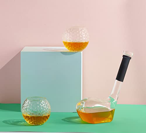 Score a hole in one with this hand blown golf club whiskey decanter bottle and matching golf ball old fashioned whisky glasses bar set.