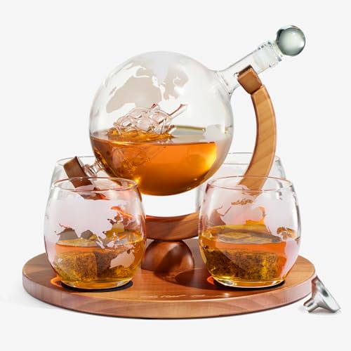 Gifts for Men Dad, World Globe Whiskey & Wine Decanter Globe Set & 4 Etched Glasses, Anniversary Birthday Gifts for Him Husband Boyfriend, Gift for Bourbon Scotch Liquor, Cool Set with Whiskey Stones