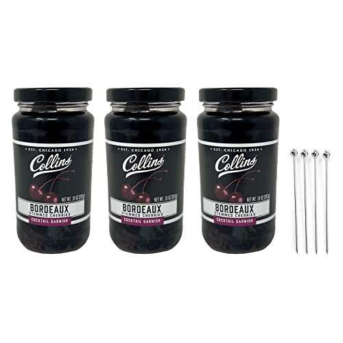 Collins Bordeaux Stemmed Cherries (3 Pack, 10oz Each) bundled with complimentary 4-count Stainless Steel Cocktail Picks – Premium, Dark Cherry Garnish For Cocktails, Bourbon Cherries For Old Fashioned, cherries for manhattan cocktail – Multipack – Bulk