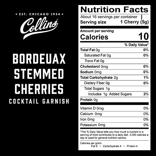RICH FLAVOR – These gourmet cherries give your favorite tipple a rich flavor. Throw a couple of these old fashion cherries into your cocktail for a boost in flavor and authenticity. STEMMED BORDEAUX CHERRIES – Discover a gourmet jar of Bordeaux cherries with a stem. Deep purple and juicy, these black cherries for Old Fashioned drinks are perfect for creating the classiest of cocktails. Try these cherries with desserts to add a kick to milkshakes, ice cream, pastries, and more. And, of course, we won’t judge you if you want to eat them straight from the jar. Collins supplies cocktail drinkers with quality staples for their home bar. Formulated with professional bartenders, Collins garnishes are made with real juice and real sugar. Enjoy a quality drink at home!