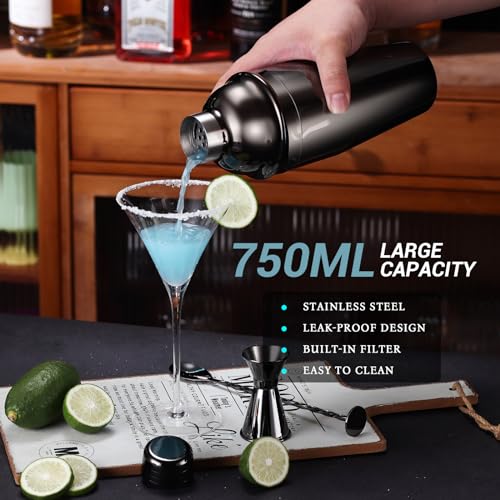 Cocktail Shaker Set Bartender Kit with Stand, 12 Piece Bar Set Drink Mixer Set with Stainless Steel Bar Accessories Tools: 25oz Martini Shaker Jigger Strainer Spoon Muddler for Cocktails (Black)