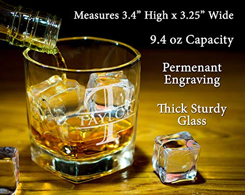 Set of Whiskey Rock Glasses. Color: Clear Glass. Size: 9.4 oz. Width: 3.25″ Height: 3.4″ Dishwasher safe. Not for canning or for hot liquids. Decanter Capacity: 23 3/4-ounce. Dimensions: 10.5 High 5.5 Wide 3 Deep (Inches). Color: Clear Glass. Engraved Color: White