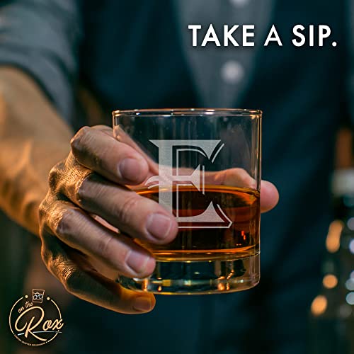 (E-Monogram)- 4 Piece Set of 11 Ounce Engraved Heavy Base Rocks Glasses Elegant Glass-Multi-Purpose Beverage-Rocks Glass- Gift for any Occasion- By: On The Rox