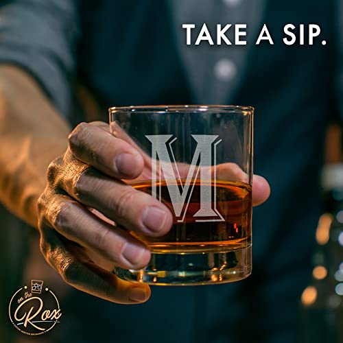 (M-Monogram)- 4 Piece Set of 11 Ounce Engraved Heavy Base Rocks Glasses Elegant Glass-Multi-Purpose Beverage-Rocks Glass- Gift for any Occasion- By: On The Rox