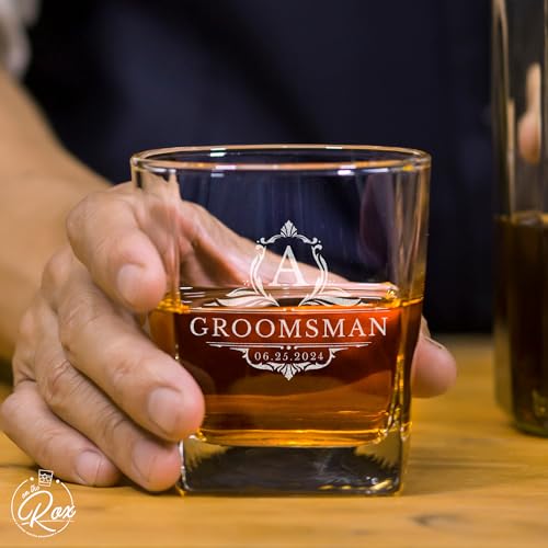 UNIQUE GROOMSMAN TRIBUTE: Each customized square bottom whiskey glass becomes a treasured keepsake. Personalize with names, initials, dates, and roles for a memorable keepsake.