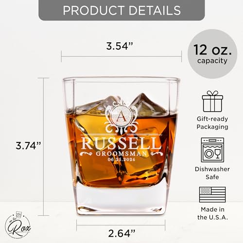 Personalized Groomsmen Whiskey Glass Gifts – Custom Engraved Square Bottom Glass for Wedding – 12 oz Bourbon, Scotch Glass – Groomsman Favors