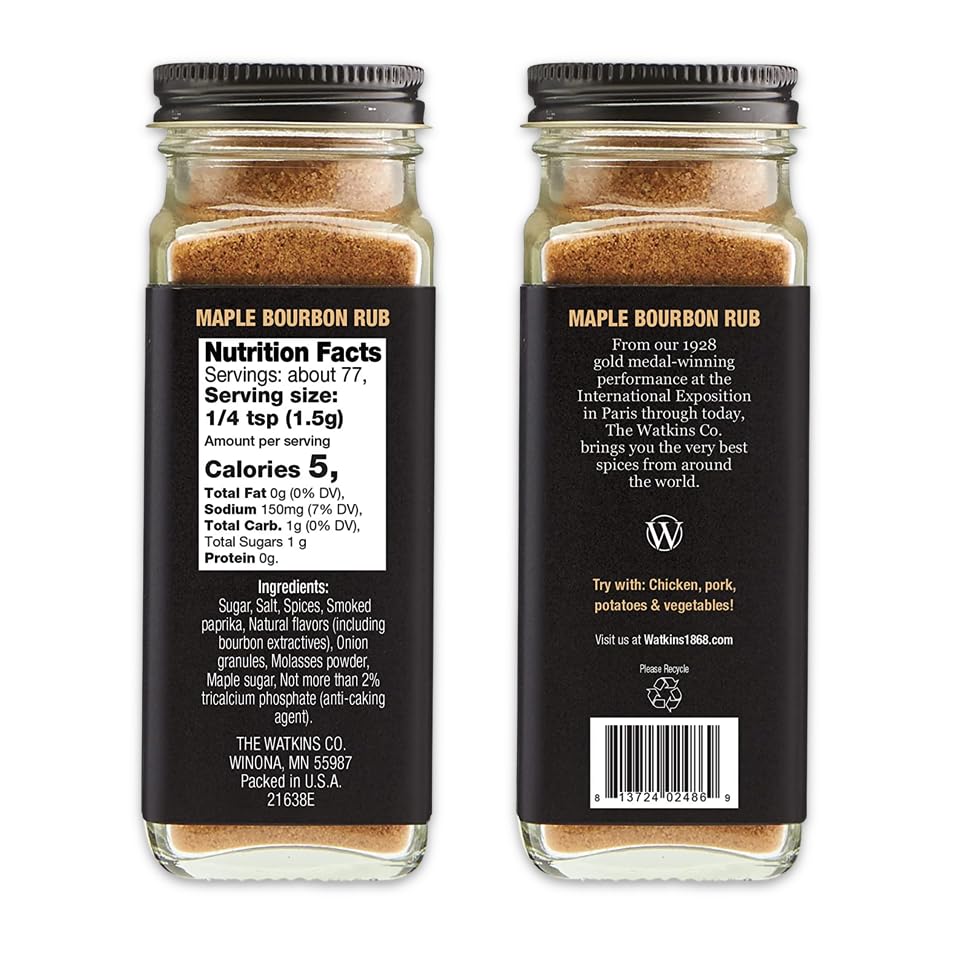 Bring bold flavors to your kitchen or grill with Watkins Maple Bourbon Rub. This delicious seasoning blend balances sweet maple with hints of smoky oak. Made with natural bourbon flavors, Watkins Maple Bourbon Rub is a perfect complement to smoked meats. Use the robust blend as a rub on poultry, beef, pork, or seafood. Watkins Maple Bourbon Rub is non-GMO project verified and made with the highest quality ingredients. For over 100 years, Watkins has offered only the best herbs and spices from around the world. Our spices contain the highest quality volatile oils and are packaged for optimal freshness in premium glass bottles.